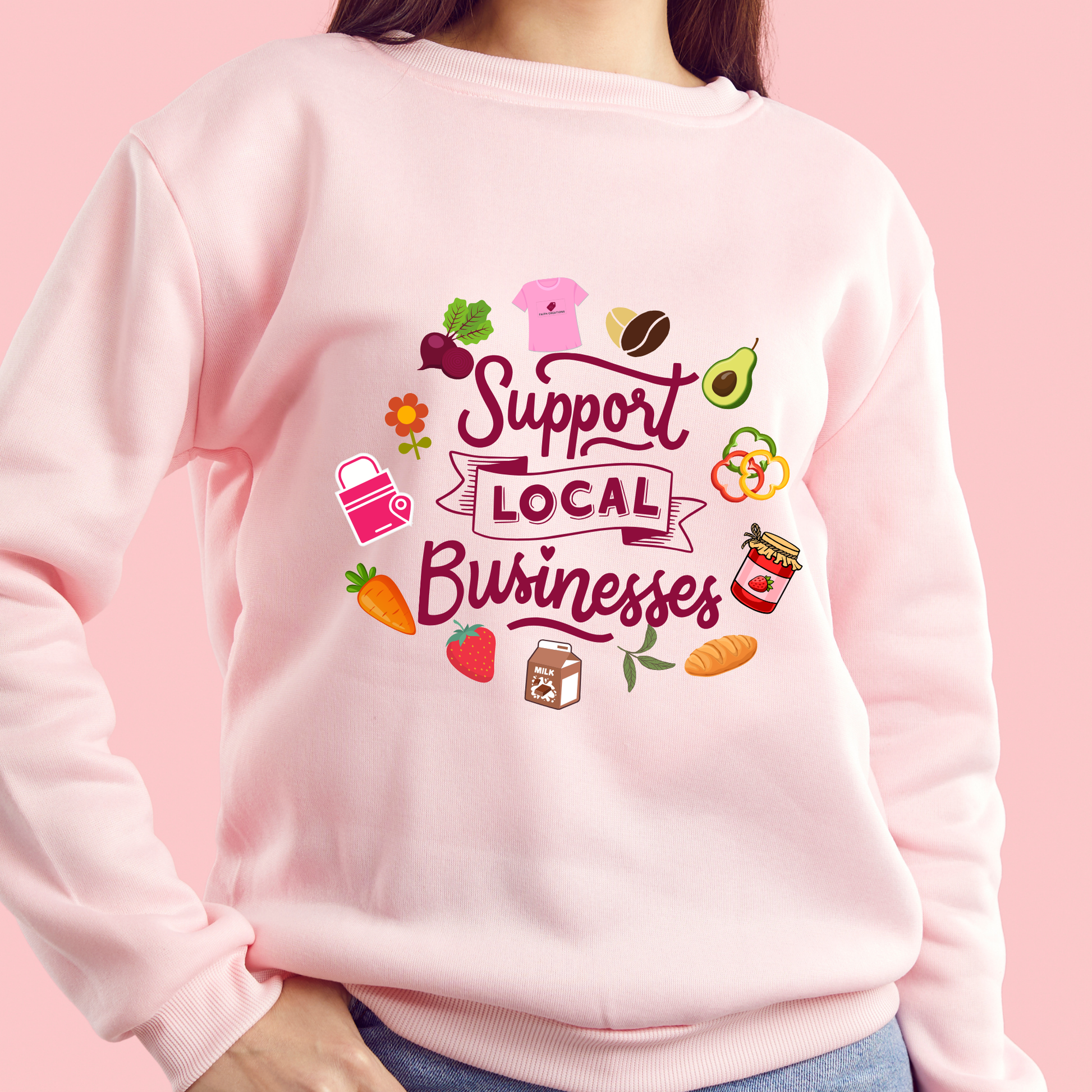 Show your love for small businesses with this Support Local Businesses sweatshirt! Featuring a vibrant design with fresh produce, coffee, and handmade goods, this cozy sweatshirt is perfect for entrepreneurs, market lovers, and community supporters.